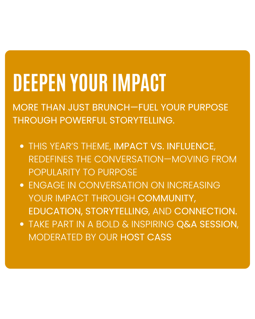 Through intentional dialogue, dynamic panels, and curated moments of connection, our speakers will guide attendees on how to use their voice, platform, and passions to cultivate impactful influence. From building community and championing education to elevating untold stories and embracing authentic leadership—this year’s brunch is designed to move you beyond aesthetics and algorithms.