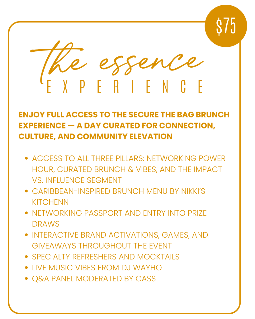We’re thrilled to unveil the first-ever Secure the Bag Brunch, taking place in Mississauga at the beautifully curated Superior Studios. Centered around the theme Impact vs. Influence, this launch event invites a powerful conversation about realigning today’s definition of influence with legacy-building impact.